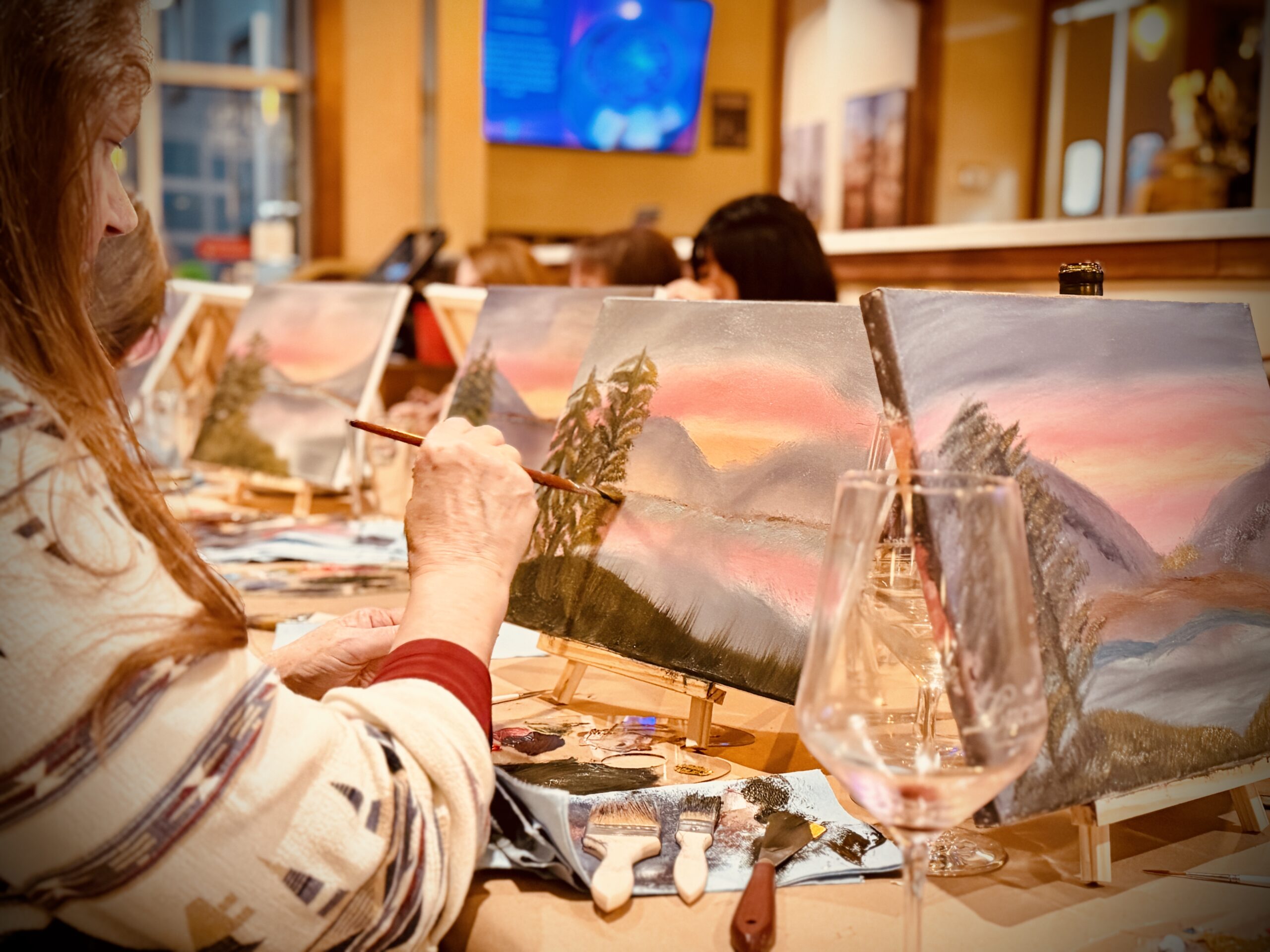 Imagine stepping into a calm, warm-lit space for one magical evening… a glass of wine in hand, soft music in the air, and the meditative flow of wet-on-wet oil painting guiding you as a gorgeous landscape comes alive on your canvas. No experience needed at all. In less than two hours, absolute beginners and returning painters alike walk away with a completed 11×14 oil painting they can’t wait to hang on their wall at home. The technique feels like pure magic – colors blend effortlessly, fluffy clouds appear in seconds, and suddenly you’ve created something truly beautiful.