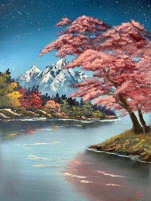 Imagine a serene escape from the hustle of everyday life, encapsulated perfectly in the painting “Peaceful Sundown.” This breathtaking work captures an idyllic scene where the delicate interplay of light and nature conjures a symphony of tranquility. The focal point, an enchanting cherry blossom tree in splendid bloom, spreads its soft pink petals against a cool, star-flecked sky, suggesting the delicate beauty of early spring evenings. The crisp, snow-capped mountains in the distance stand majestic, providing a stark contrast to the gentle serenity of the blooming tree. Below, a mirror-like river captures the last whispers of sunset, reflecting the pinks and blues of the sky and the fiery golds of autumnal trees lining its banks. Every brush stroke and color choice in “Peaceful Sundown” invites viewers to pause, reflect, and experience a moment of peace. As the stars begin to twinkle in the twilight sky, one can’t help but feel a connection to something larger, a reminder of nature’s quiet glory and the respite it offers. This artwork transforms any space into a haven of calm and celebrates the profound ability of art to move and inspire.