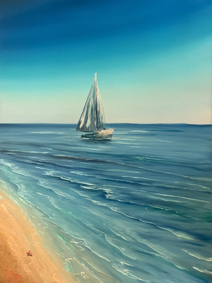 ‘Set Sail’ invites you to a serene coastal realm, where a sailboat glides peacefully across azure waters under a boundless sky. This painting captures the beauty and mystery of the sea, becoming a beacon of calm and inspiration in your home.