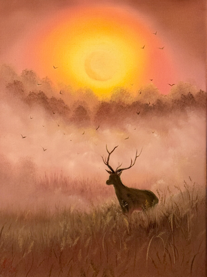 Imagine yourself standing at the edge of a tranquil meadow as the sun begins to set, casting a warm, glowing orb into the sky, bathing everything in a golden-rose hue. ‘Ten Point Buck’ captures this serene moment with impeccable grace and artistry. The painting invites you into a peaceful world where time slows down, and nature’s beauty takes center stage. A majestic buck with impressive antlers stands proudly in the foreground, silhouetted against the fiery sunset. The artist masterfully renders the deer with meticulous strokes that capture the texture of fur and muscle. The sky is a spectacle of shades that melt into each other, enveloping the clouds and flying birds in a magical glow. Subtle details—the sway of tall grass, fluttering birds, and layers of fog—add a mystic allure. ‘Ten Point Buck’ is more than a painting; it’s a piece of tranquility for your home, perfect for nature lovers, sunset admirers, or those seeking peace in daily life.